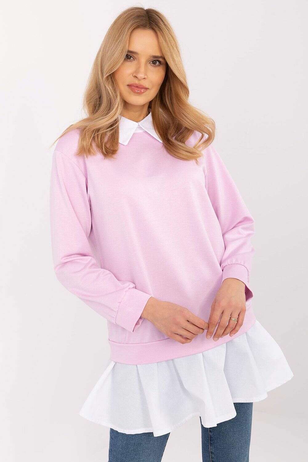 The look is defined by a classic collar and a shirt insert at the bottom, adding structure and refined detail to a versatile piece that pairs beautifully with both tailored trousers and casual denim.