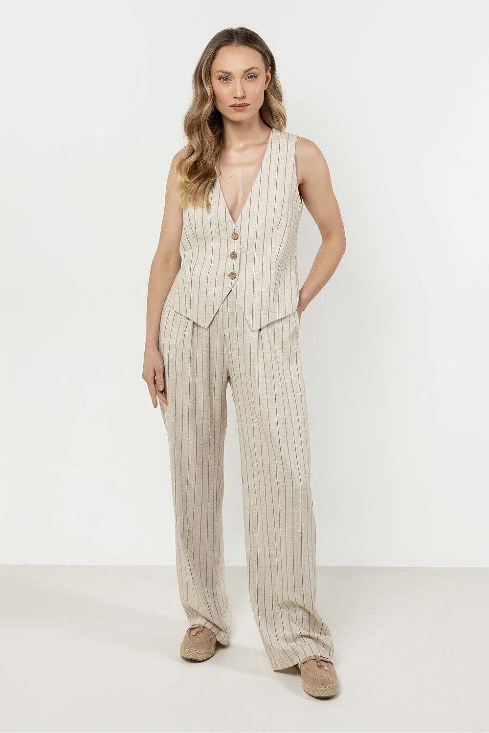 Linen trousers with wide legs in delicate stripes These trousers are the perfect combination of elegance and everyday comfort. Made of linen, they ensure breathability and fit perfectly on the silhouette. The wide legs add freedom, and the elastic waistband guarantees a perfect fit. The classic pattern of thin stripes makes them suitable for many outfits. Pair the linen trousers with a vest or jacket made of the same fabric, and you'll create an elegant summer look.